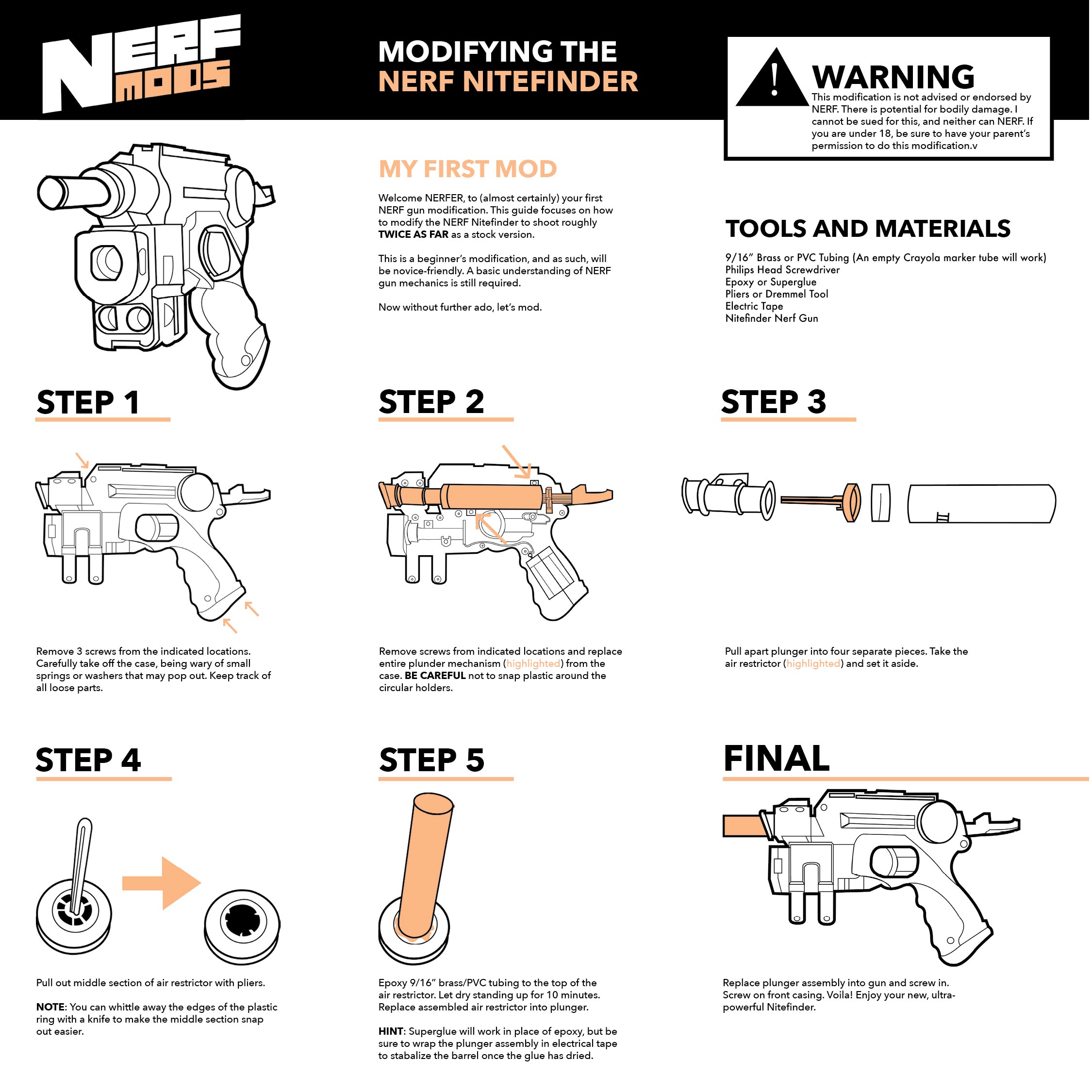 Modifying Nerf guns used to be a longtime hobby of mine and my brother's, so I decided to revisit the past by making some instruction manuals to help the internet make their own modifications to their favorite plastic pistols.
